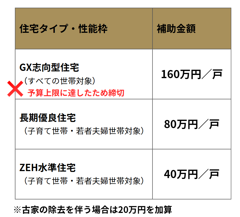 GX志向型住宅を購入する場合は、すべての世帯が対象となりますが、こちらについては予算枠上限に達したため、すでに申請を締め切りました。