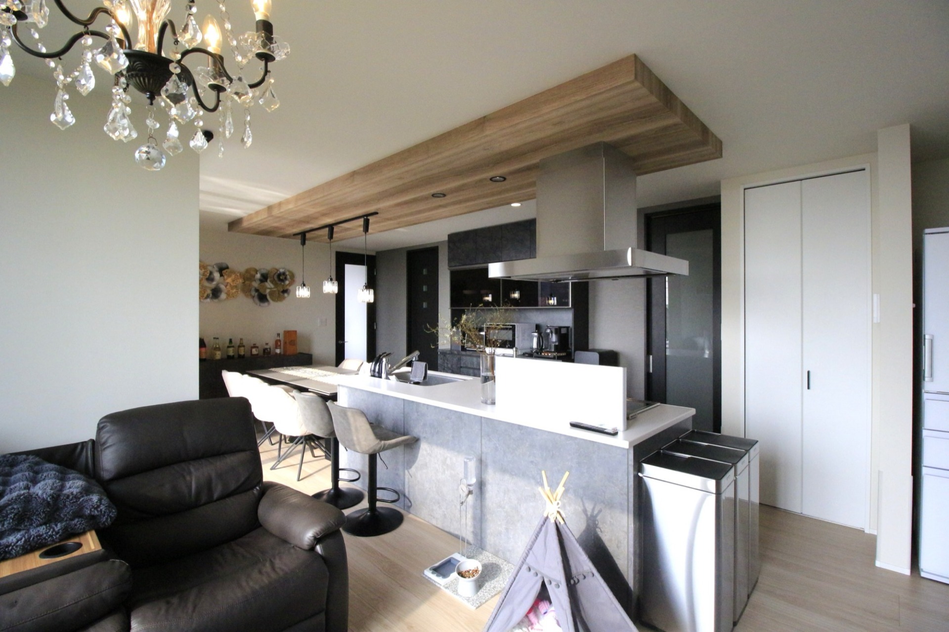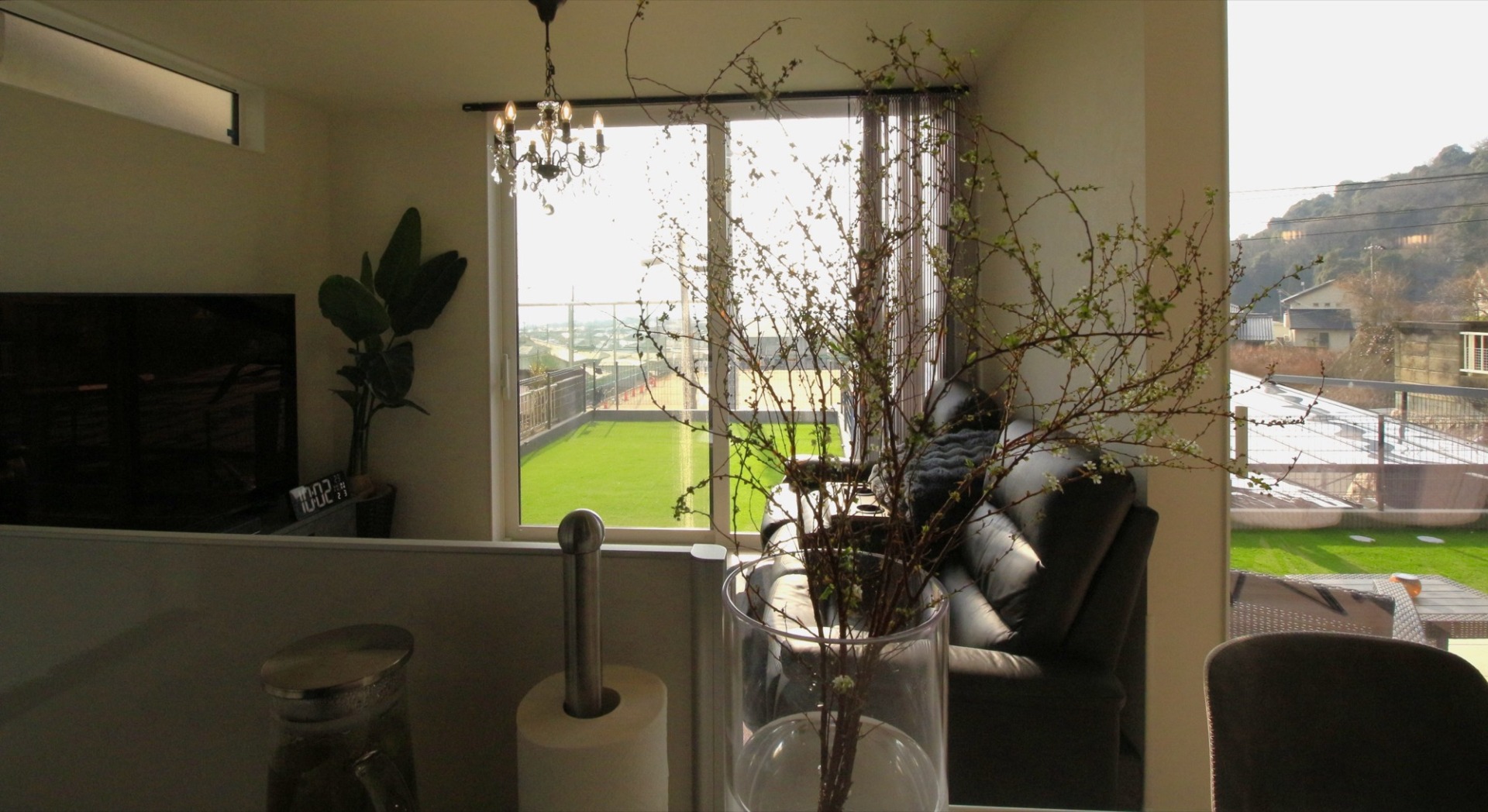リビングには、ご入居後に取り付けられたおしゃれなシャンデリアが!