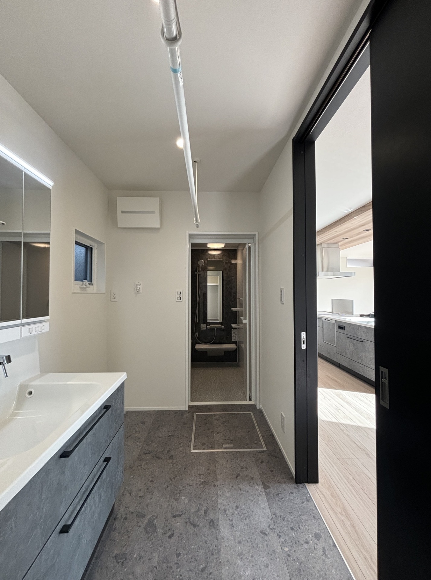 キッチンの背後はランドリールームを兼ねた洗面脱衣所で家事動線も良好。