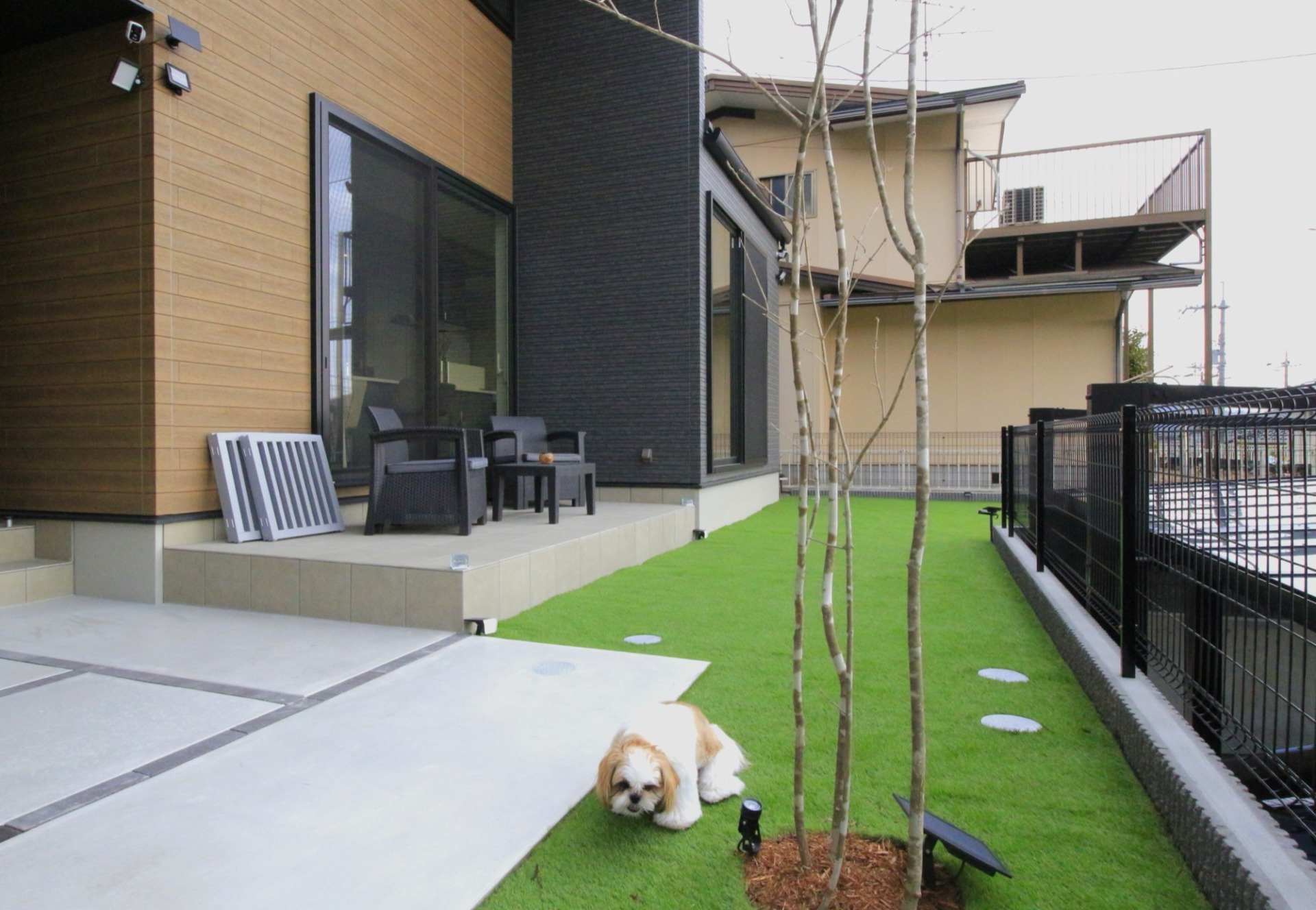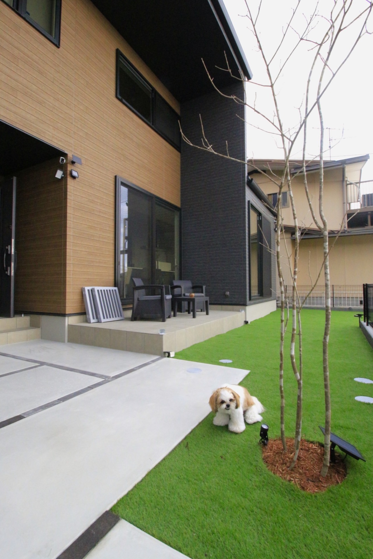 ガレージとガーデンスペースがセパレートなので、芝生の庭はワンちゃんが思いっきり駆け回れる広さ。LDKの前にタイルテラスも設けました。