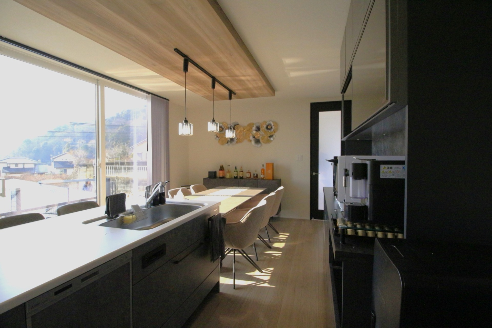 天井までのワイドなハイサッシに向かって設えられた横並びダイニングキッチン。