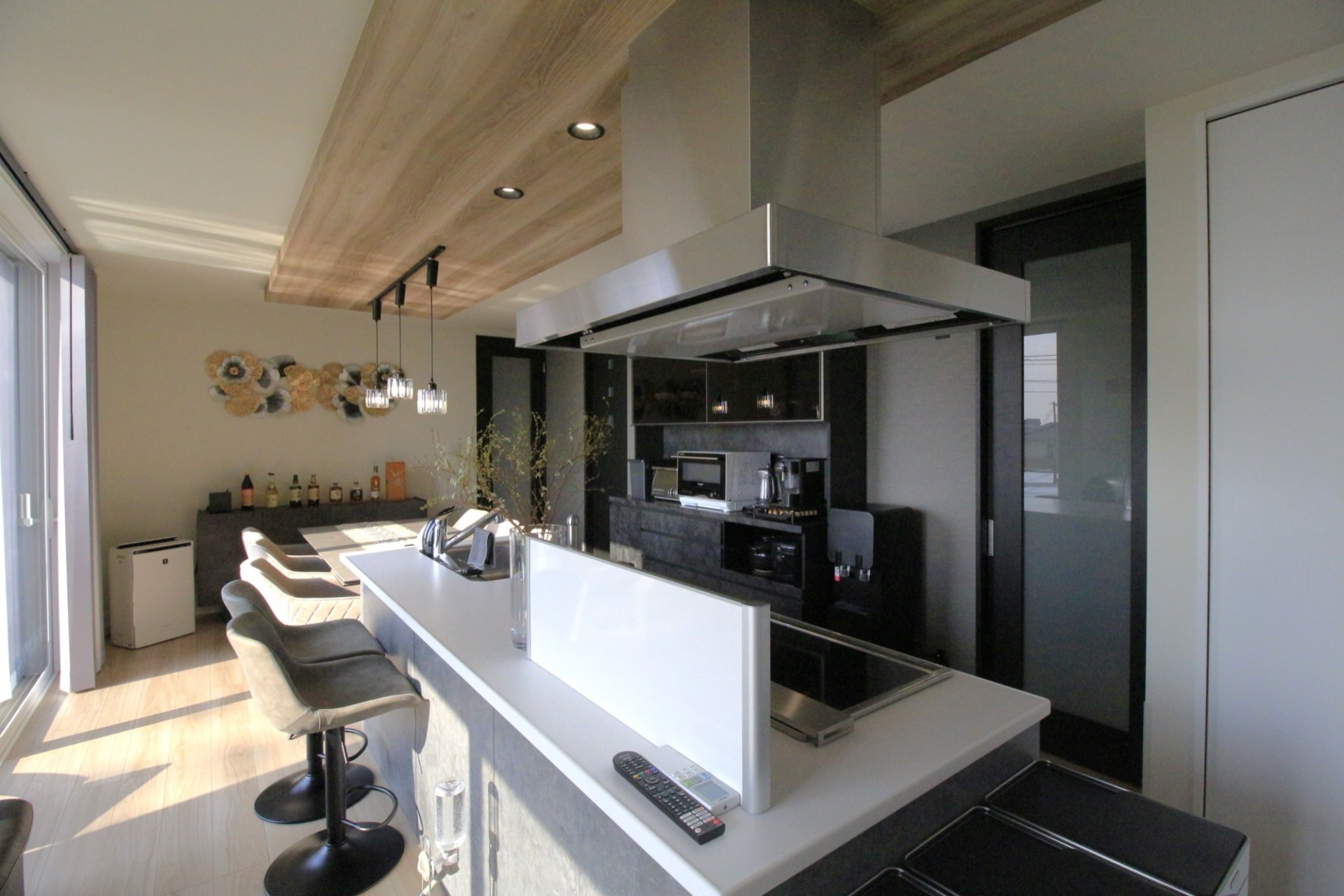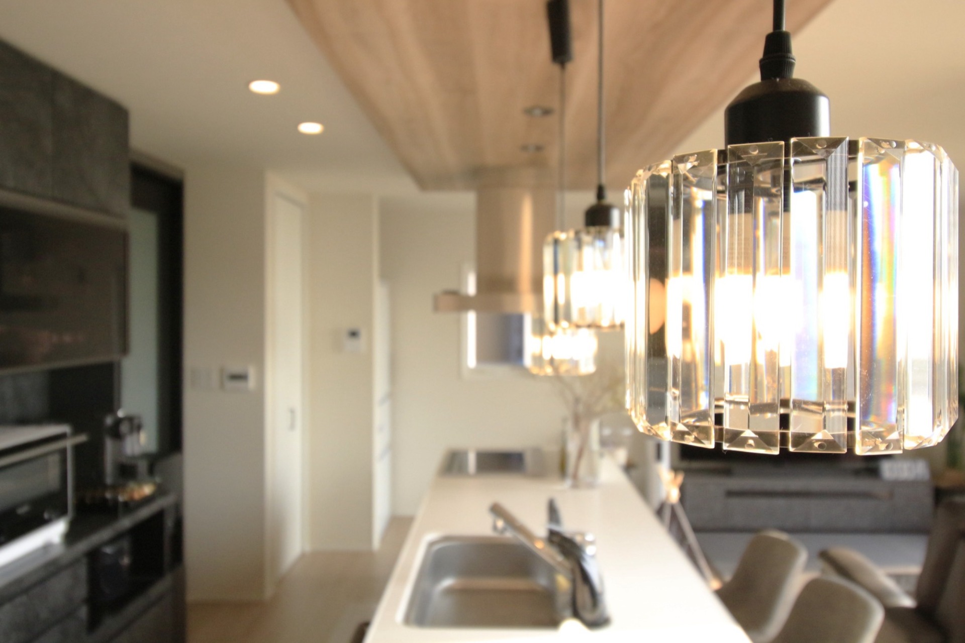 キッチンからダイニングまでつながる折り下げ天井。ダクトレールでペンダントライトを自由に動かせます。
