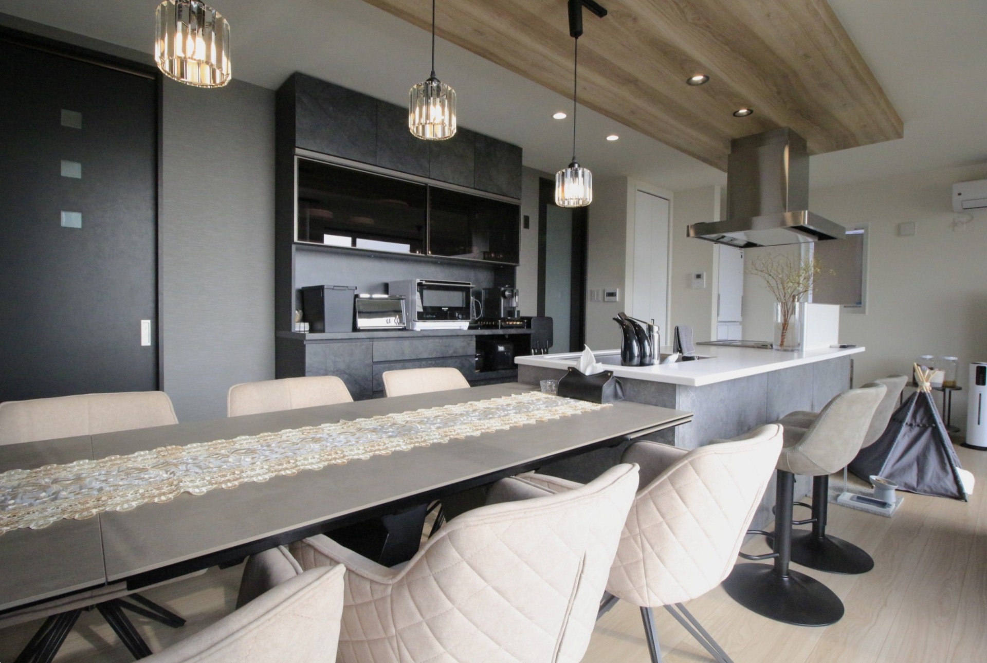 ロングサイズのダイニングキッチンとアイランドキッチンが並んだ、隠れ家レストラン風の食卓。みんなでわいわい、ホームパーティーもできるサイズです。