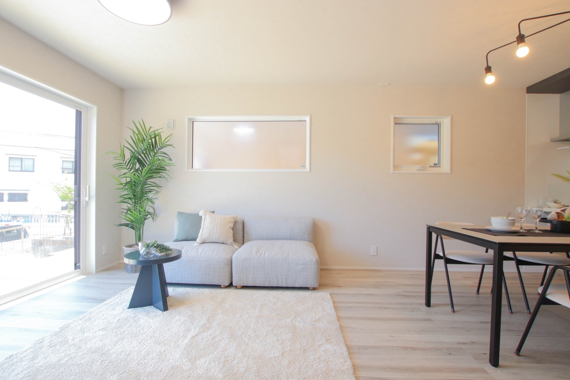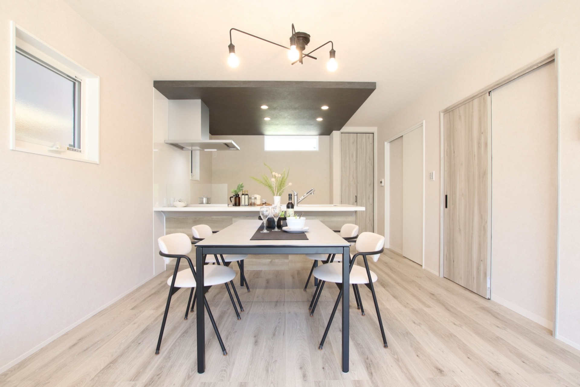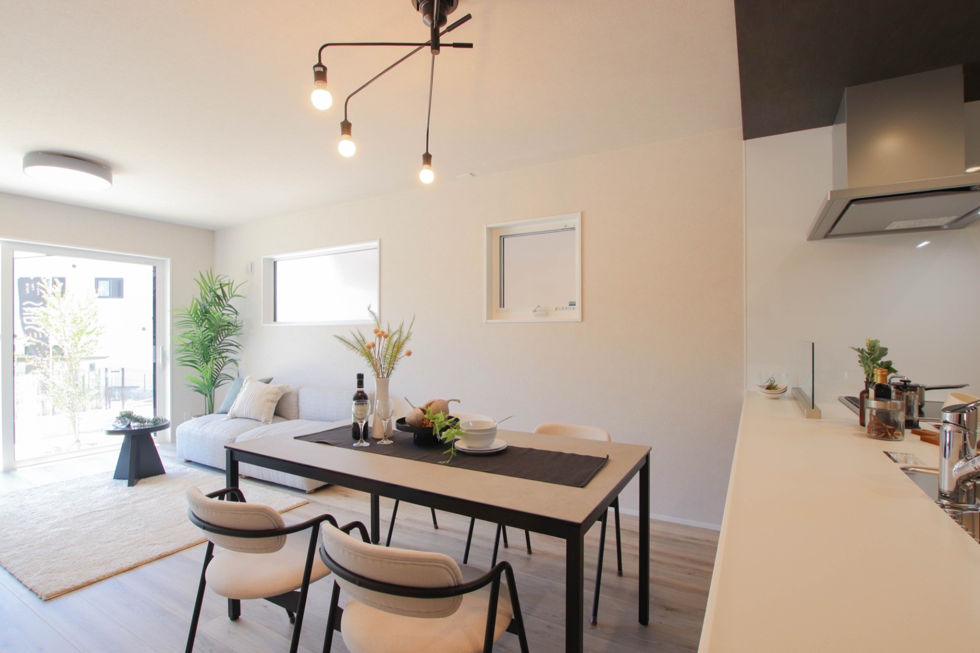 広々としたLDKは視線が抜けるストレートタイプ。キッチンから全体が見渡せ、また庭で遊ぶお子さまにも目が届きます。
