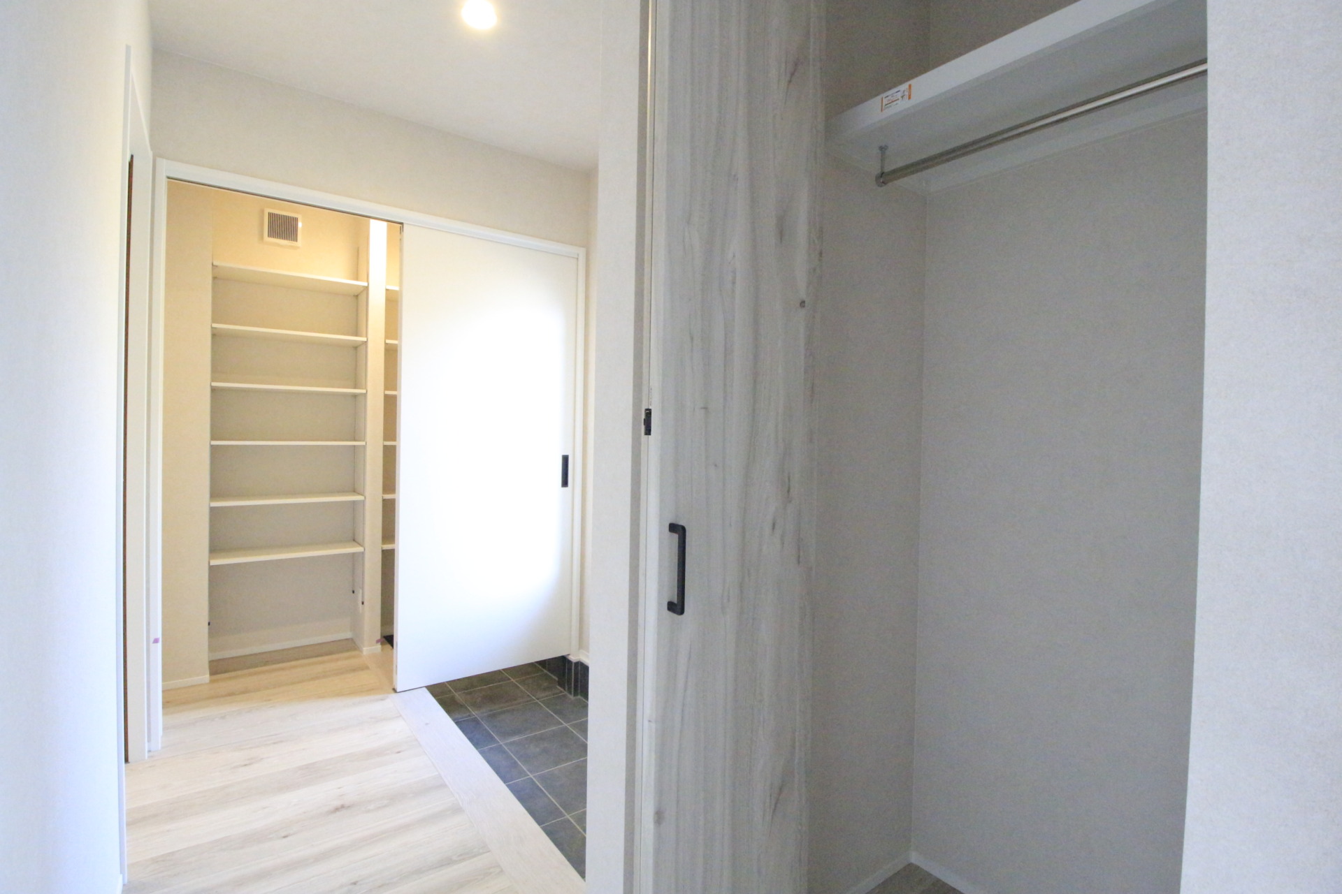 玄関ホールは左右に収納付き。大きなシューズクロークと、ハンガーパイプ付きのクロークがあります。上着類はここに入れれば、花粉の時期に家の奥までアレルゲンを持ちこむ心配がありません。