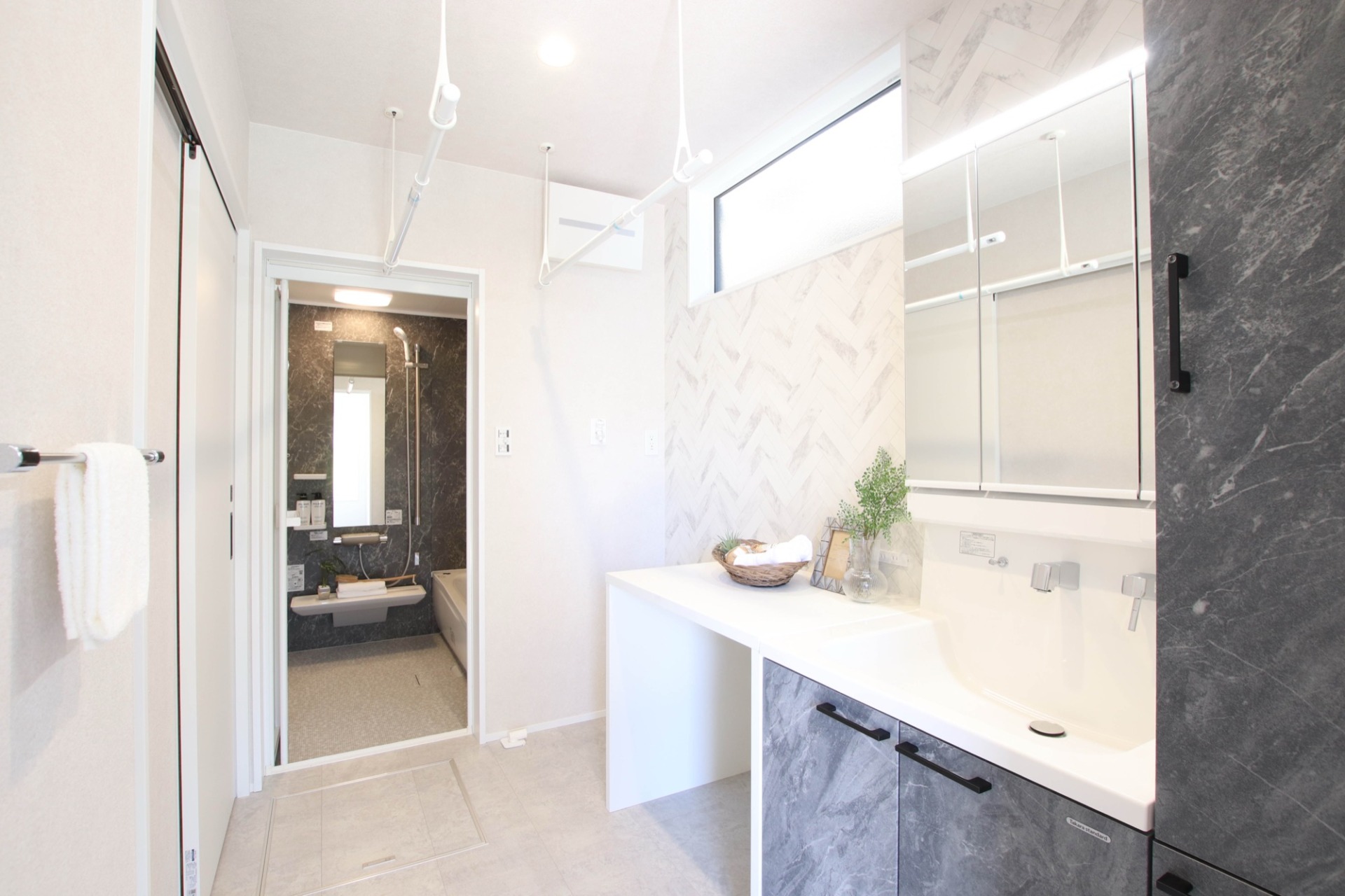 洗面化粧台は、洗濯の作業台やメイクスペースとして使えるカウンター付き。