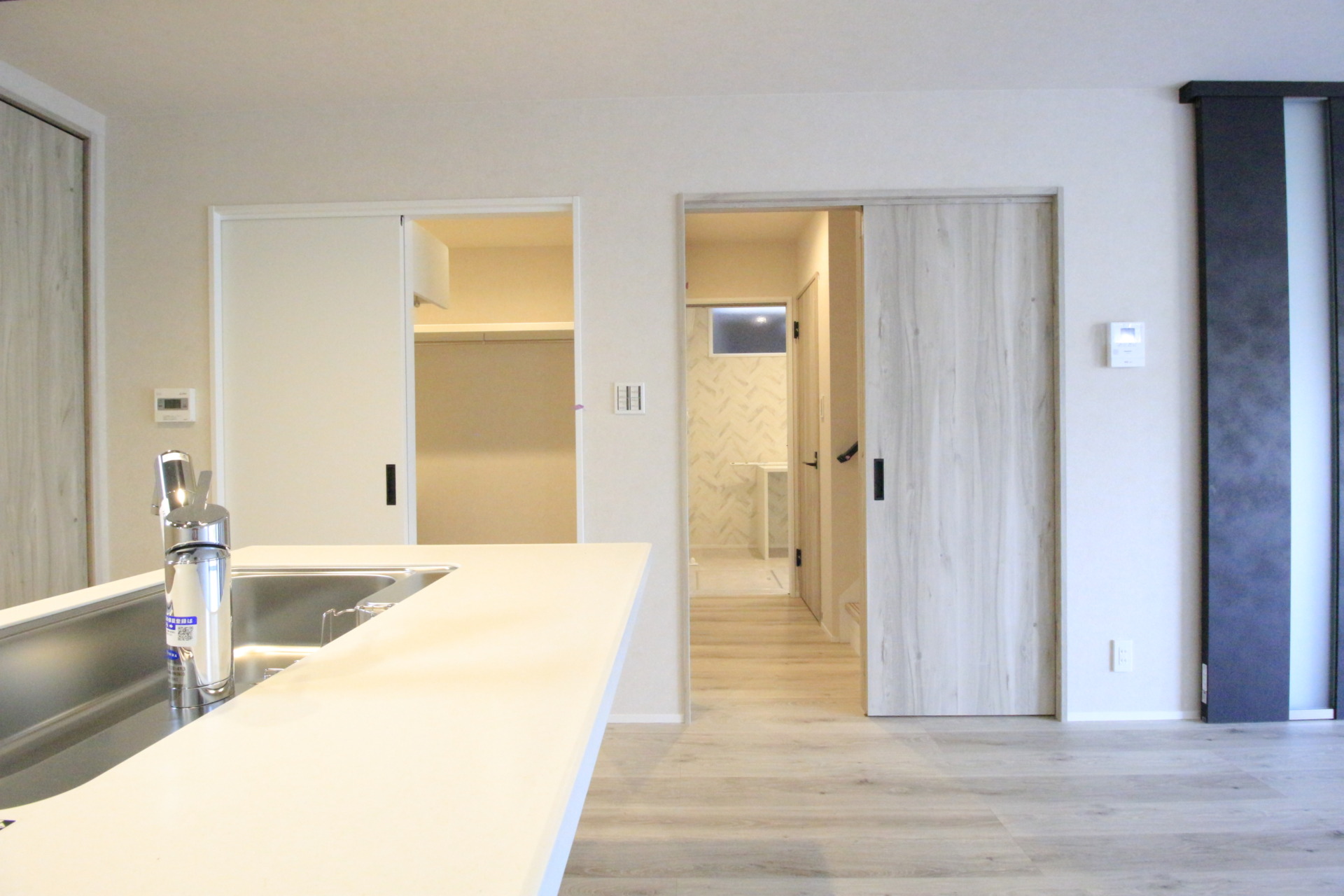 LDK側から見ると、玄関→洗面室→ファミリークローク→キッチン(LDK)がつながっていて、「おかえり動線」「家事動線」ともにスムーズなのが分かります。