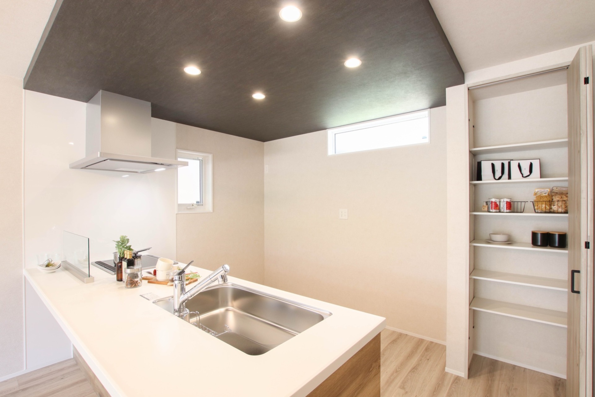 キッチン上部には折り下げ天井を配してスタイリッシュに。