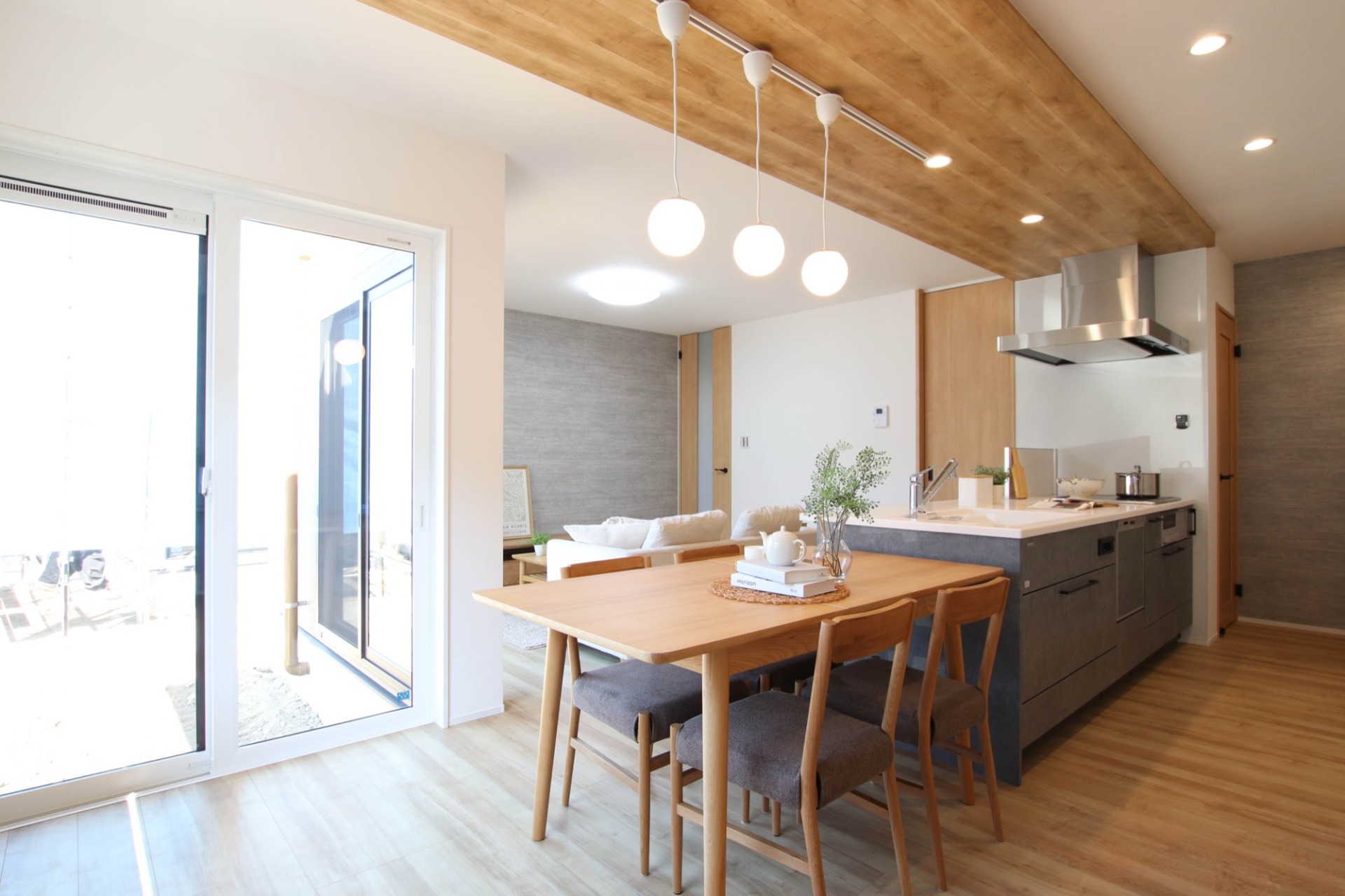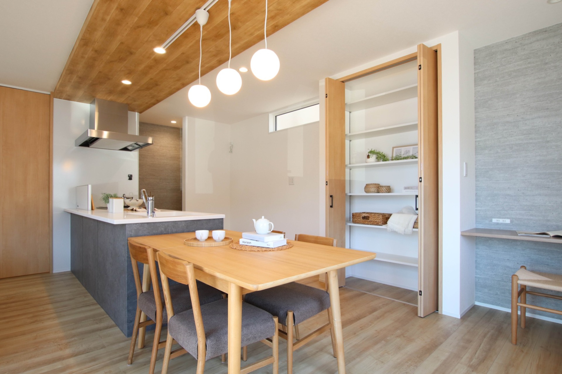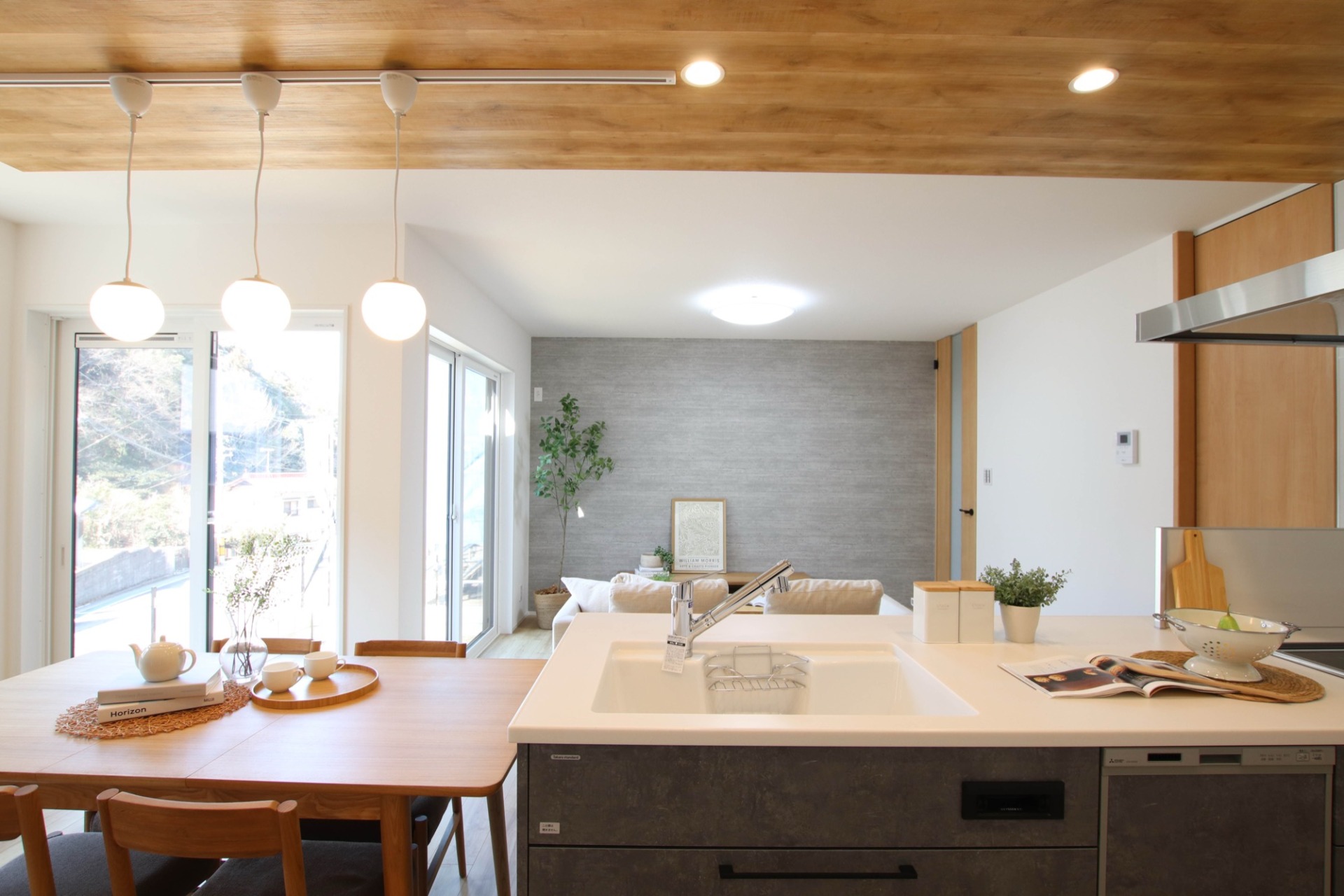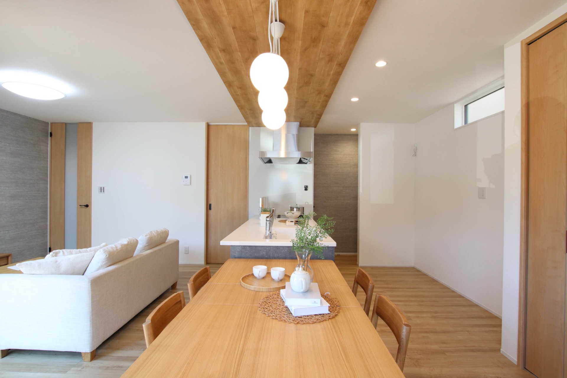 ダイニングキッチンの上部は折り下げ天井で、横長のラインを強調。
