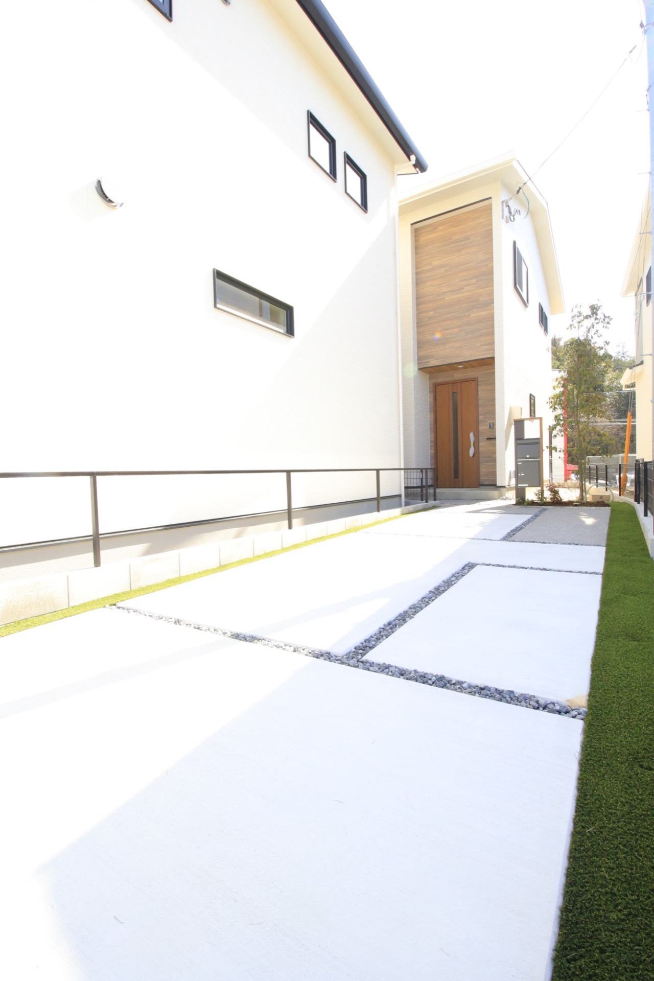 外構は旗竿地を活かした、おしゃれなアプローチが印象的。