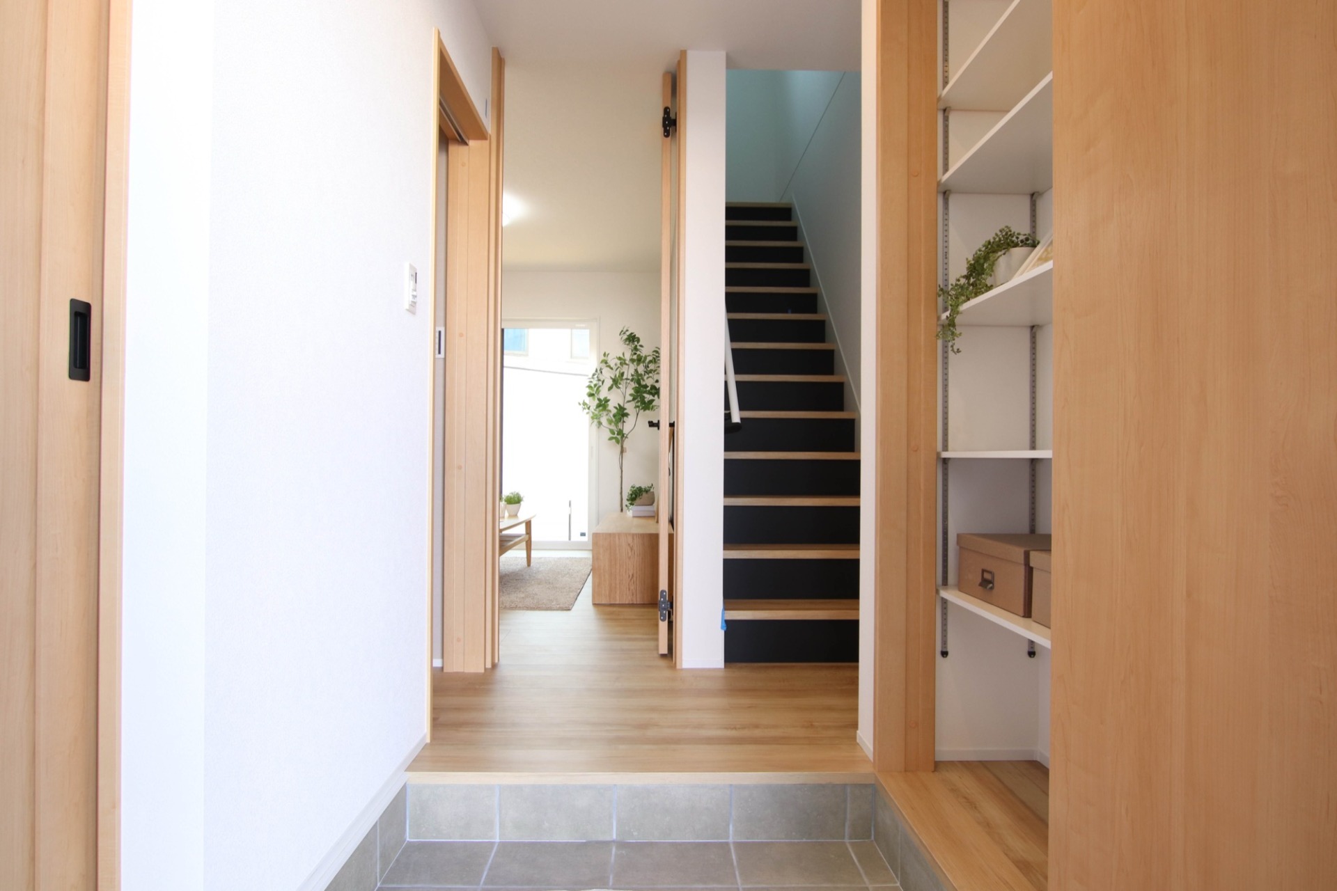 左手手前のドアはシューズインクローク(土間収納)、左手奥のドアはファミリークローゼットにつながっています。