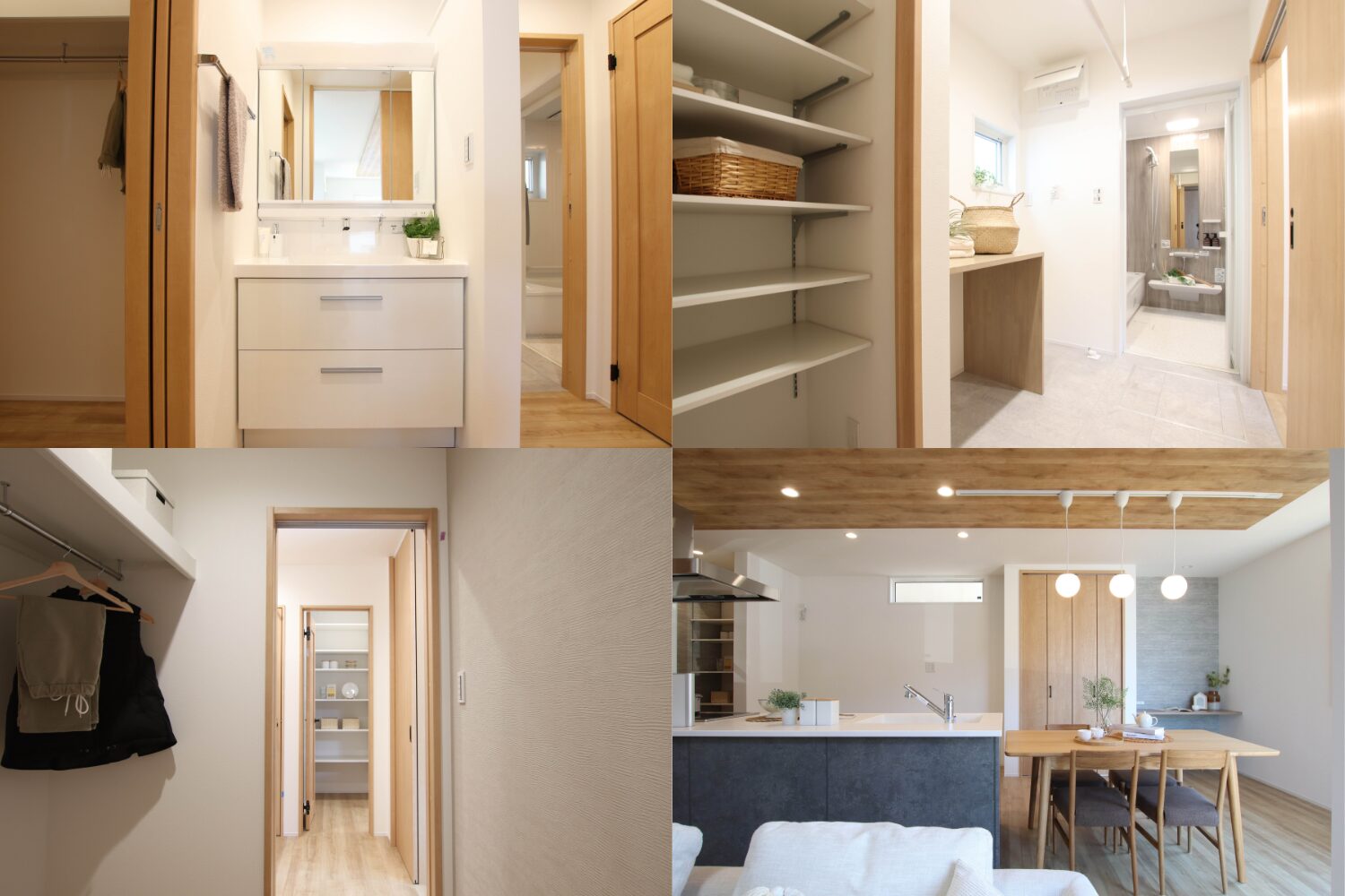 玄関→シューズクローク→脱衣室→浴室をつなぐ「お帰り動線」。ファミクロ→独立洗面→パントリー→キッチンに加えて脱衣室兼ランドリールームが連続する「家事楽動線」。2つの動線が一体化して、行き止まりなく回遊できます。